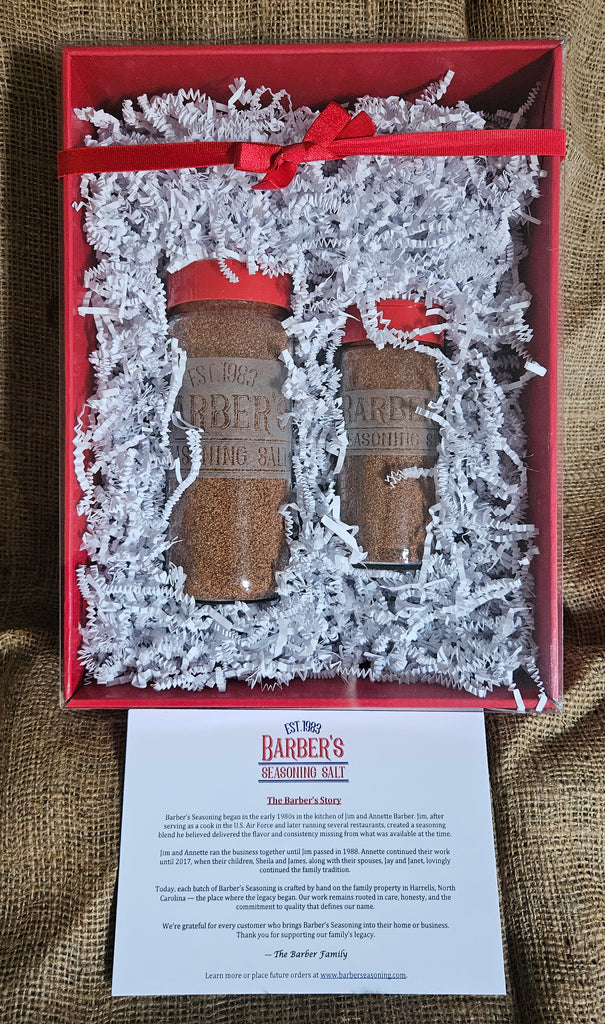 Share the flavor and the heart behind Barber's Seasoning Salt with our thoughtfully crafted Gift Box set.  Inside, you'll find two premium glass shakers  - on large, and one standard - each etched with the Barber's Seasoning logo and filled with our beloved seasoning salt. Together, they hold over a pound of the blend made with care in every batch.  We've also included two special cards: one listing the ingredients, and another sharing our story and our website for future orders.  These are tucked safely under the crinkle shred in gift box, so make sure to look before tossing anything away.  whether you're surprising a foodie, thanking a host, or treating yourself, this gift box brings the perfect blend of flavor, craftsmanship, and Barber family tradition.